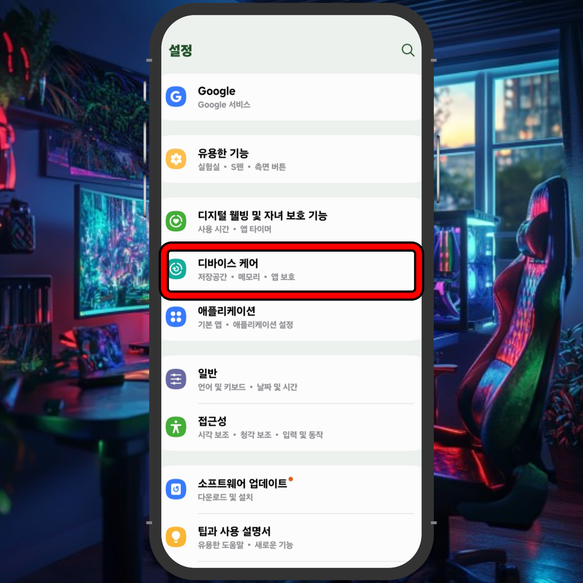 설정 메뉴에서 **'디바이스 케어'**를 선택합니다.